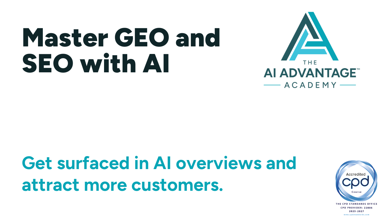 With AI Overviews now dominating Google search, there has never been a better time to master the new SEO and GEO rulebook. In just 2 hours, you’ll discover how to get your business surfaced in AI-driven results, create optimised content in seconds and put GEO and SEO to work to attract more customers.